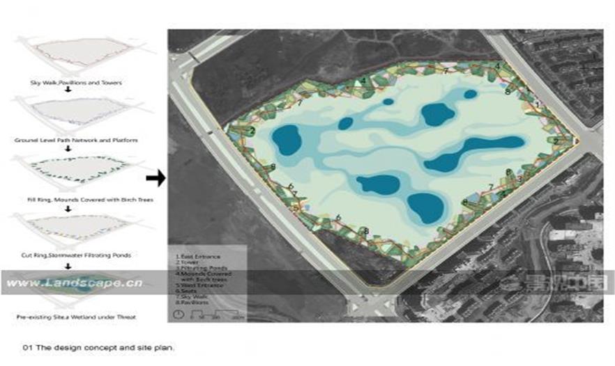 設(shè)計策略是保留場地中部的大部分區(qū)域作為自然演替區(qū),沿四周通過挖填方的平衡技術(shù),創(chuàng)造出一系列深淺不一的水坑和高地不一的土丘,成為一條藍(lán)-綠項鏈,形成自然與城市之間的一層過濾膜和體驗界面。沿四周布置雨水進(jìn)水管,收集城市雨水,使其經(jīng)過水泡系統(tǒng)經(jīng)沉淀和過濾后進(jìn)入核心區(qū)的自然濕地山丘上密植白樺林,水泡中為鄉(xiāng)土水生和濕生植物群落。高架棧橋連接山丘,布道網(wǎng)絡(luò)穿越于丘林。水泡中設(shè)臨水平臺,丘林上有觀光亭塔之類。創(chuàng)造豐富多樣的體驗空間。