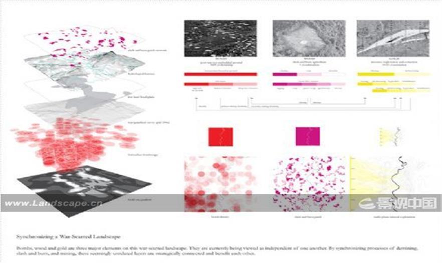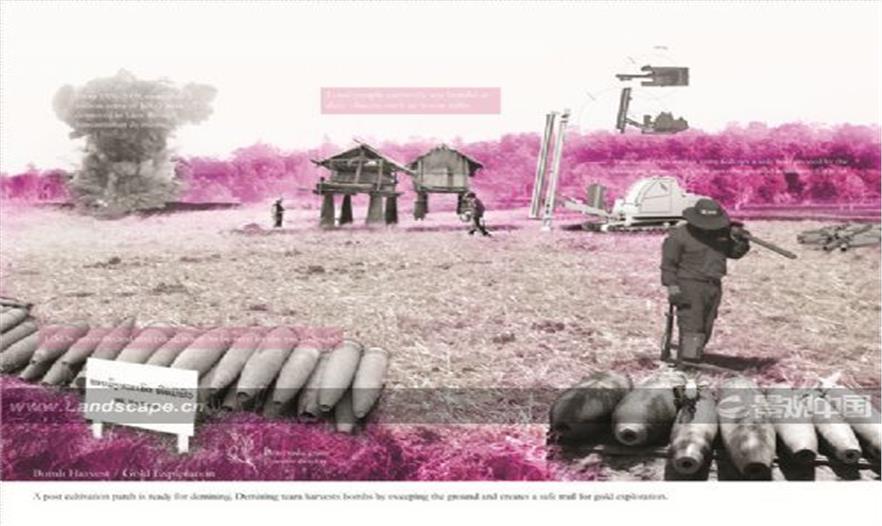 該設(shè)計提出,在老撾戰(zhàn)后重建過程中,應(yīng)在資源開采與遺存金屬處理之間建立新的循環(huán)經(jīng)濟(jì)連接點,以改善生存在被嚴(yán)重破壞的戰(zhàn)后景觀之上的當(dāng)?shù)厝说纳嫾吧鷳B(tài)環(huán)境。該項目試圖建立一種景觀恢復(fù)和再造途徑,即利用金礦開采過程來排除遺留在老撾境內(nèi)未爆炸的集束炸彈;將對于從越南戰(zhàn)爭遺留下來的遍布老撾境內(nèi)的8000萬余枚炸彈的排除過程,作為重新思考礦產(chǎn)開采過程的契機(jī);將礦產(chǎn)勘查及采挖過程視為恢復(fù)和重建這片危險之地的重要途徑。