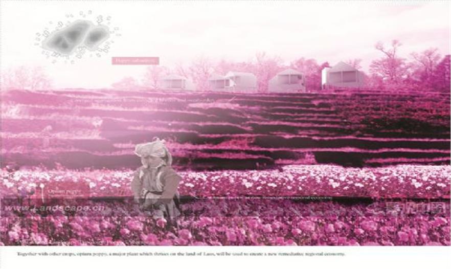 一個新的“收獲”系統(tǒng)將由此產(chǎn)生——炸彈、黃金和食物將被循環(huán)收獲:為時一年的農(nóng)耕燒荒過程在進(jìn)行食物收獲之后留下一塊無植被地塊;緊接著,排雷部隊將進(jìn)行炸彈排測,“收獲”炸彈并進(jìn)行處理,以進(jìn)行彈殼的收集和循環(huán)利用,這一過程將為下一步即將開始的礦產(chǎn)勘測開辟一條“無彈”的安全通道;以“燒荒”地塊為基本尺度的露天井坑將成為“收獲”黃金的場地;后采礦井坑將用于臨近采礦區(qū)的尾礦儲藏。最后,海拔位于洪范區(qū)內(nèi)的礦坑將在污染物清理修復(fù)后,成為“無彈”的水產(chǎn)養(yǎng)殖場地;而海拔高于洪范區(qū)的礦坑則被改造為梯田進(jìn)行復(fù)墾過程。與其他各種用于復(fù)墾的農(nóng)作物一起,罌粟,這種在老撾土地上曾經(jīng)盛開的植物將被用于復(fù)墾過程,成為新的后采礦區(qū)域復(fù)墾經(jīng)濟(jì)中的重要一環(huán)。