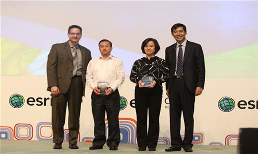 會(huì)議主辦方為“2013年Esri全球特別貢獻(xiàn)獎(jiǎng)”的兩位獲獎(jiǎng)單位代表頒獎(jiǎng)