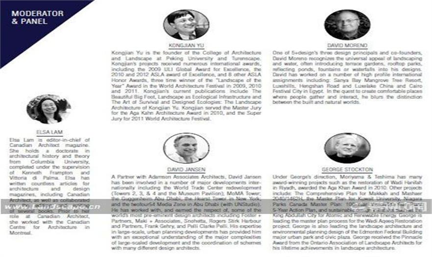 加拿大國際建筑業(yè)大會聚焦于現(xiàn)代建筑和城市規(guī)劃中水所扮演的角色,探索如何通過設(shè)計中水的整合來增強設(shè)計方案的功能性、形式和可持續(xù)性。會議討論了多種方法,包括從大尺度的恢復(fù)策略(如保護地區(qū)免受洪水危害)到小尺度的干預(yù)方法(用水來增強單個建筑的能源利用和美觀程度)。 今年的會議主持人及專家小組成員包括:北京大學(xué)建筑與景觀設(shè)計學(xué)院院長,土人設(shè)計首席設(shè)計師俞孔堅教授、5+設(shè)計公司設(shè)計負(fù)責(zé)人之一及共同創(chuàng)始人David Moreno、Adamson聯(lián)合建筑師事務(wù)所的的合伙人之一David Jansen、《加拿大建筑師》雜志的主編Elsa Lam 、Moriyama & Teshima主創(chuàng)設(shè)計師以及安大略景觀設(shè)計師協(xié)會頒發(fā)的頂點獎獲得者George Stockton。