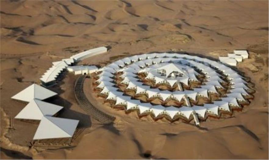 蓮花酒店坐落于響沙灣大漠黃沙中,北京以西八百公里處,位于鄂爾多斯市和包頭市之間。酒店面朝黃河支流——罕臺大川,居庫布齊沙漠東端,庫布齊大漠綿延橫亙達(dá)200公里。由于受特殊地理?xiàng)l件限制,PLaT Architects發(fā)明了一種新型建筑形式:使用鋼板架構(gòu)固定于流沙中,無混凝土無水作業(yè)。建筑師采納了中國傳統(tǒng)的“陣”之理念,即重疊之藝術(shù)。正方旋轉(zhuǎn)同樣角度構(gòu)成三角,形式上則更為堅(jiān)固。建筑師綜合考量結(jié)構(gòu),采光和通風(fēng)諸因素,使蓮花酒店在建筑形式上集功能,外形和景觀于一體。