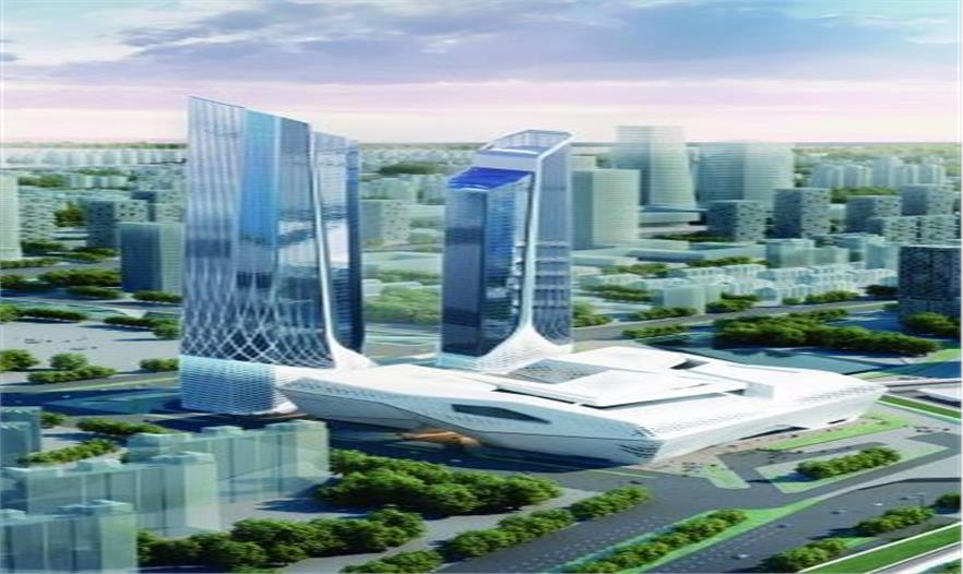 項(xiàng)目由全球知名的英國扎哈·哈迪德設(shè)計(jì)事務(wù)所設(shè)計(jì),由會議中心和兩座塔樓構(gòu)成。南塔樓58層、高255米,北塔樓68層,高314.5米。這一工程于2012年4月26日開工,今年6月30日封閉外幕墻。