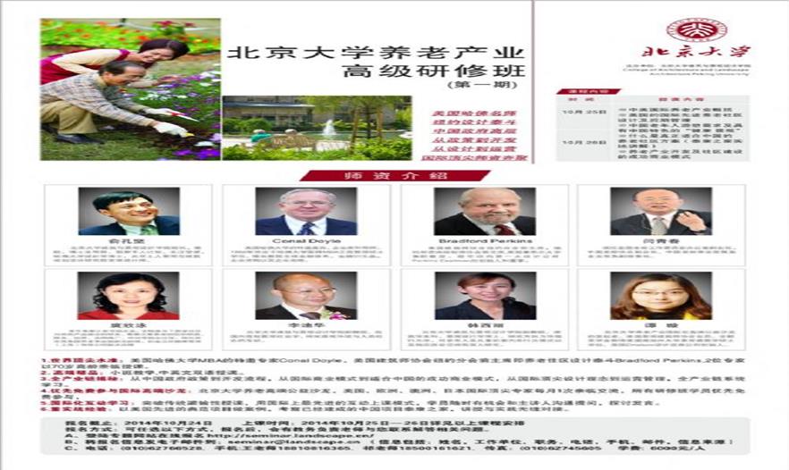 北京大學作為國家的頂層高等學府,更應該關注中國的現(xiàn)實問題,特別是大眾養(yǎng)老的問題,讓我們用國際化的頂層知識,推動養(yǎng)老產(chǎn)業(yè),為國家?guī)椭嗟睦夏耆?,做更多大眾的公益事業(yè)。所以我們建筑與景觀學院為大家搭建起一個國際最頂尖的學習平臺,結合美國哈佛大學導師,紐約養(yǎng)老住區(qū)設計泰斗,中國政府領導以及養(yǎng)老產(chǎn)業(yè)國際實戰(zhàn)專家,定期組織養(yǎng)老產(chǎn)業(yè)國際化高級研修班課程,從中國與國際養(yǎng)老產(chǎn)業(yè)政策、開發(fā)過程、成功的商業(yè)模式、國際頂尖設計、運營和管理,全產(chǎn)業(yè)鏈揭秘,用美國、中國實際案例與建成項目考察學習的實戰(zhàn)方式,以國際先進的養(yǎng)老理念,指導中國實際項目開發(fā)與建成運營,幫助企業(yè)抓住這個養(yǎng)老產(chǎn)業(yè)的戰(zhàn)略機遇,號召起全社會對老年公益事業(yè)的推動。