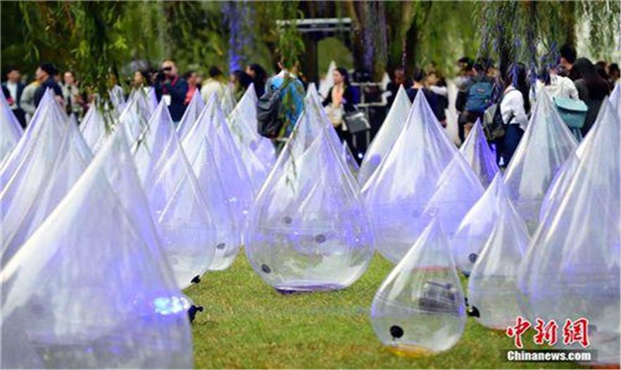 10月18日傍晚,為期一周的“2014舞動的水滴”藝術(shù)展在杭州西湖柳浪聞鶯公園亮燈開幕。本次藝術(shù)展源自杭州市政協(xié)港澳臺僑和外事委員、跨界藝術(shù)家馬興文先生參加第55屆威尼斯國際藝術(shù)雙年展的同名雕塑作品,整組作品由漂浮在西湖湖面上的五個高度12—20米的水滴型充氣模型和放置在公園草坪上的數(shù)百個“小水滴”組成,意在通過“水滴看世界”,倡導(dǎo)“護(hù)水、愛水、珍惜每一滴水”的生態(tài)理念。