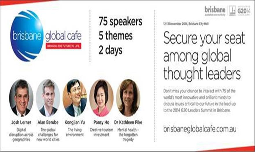 Brisbane Global Café展現(xiàn)了布里斯班的愿望,要開創(chuàng)主辦城市的一大傳統(tǒng),用思想領(lǐng)導(dǎo)能力項(xiàng)目來(lái)豐富舉辦G20峰會(huì)的經(jīng)歷,同時(shí)加深全球會(huì)議和城市重要話題的探討。