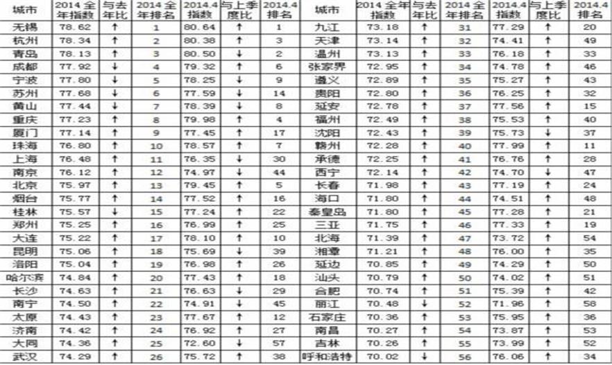 從中國(guó)旅游研究院獲悉,日前,2014年全年全國(guó)游客滿意度調(diào)查報(bào)告已在線公布。報(bào)告顯示,全國(guó)2014年全年的游客滿意度指數(shù)為74.10。在56個(gè)樣本城市中青島位居第三,與無(wú)錫、杭州同屬滿意度較高城市。濟(jì)南位居24名,也超過(guò)了全國(guó)的平均水平。