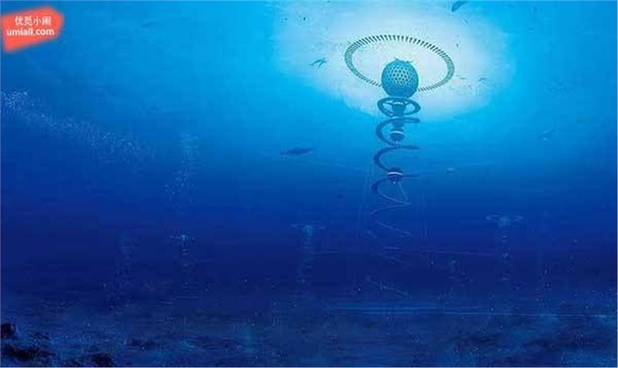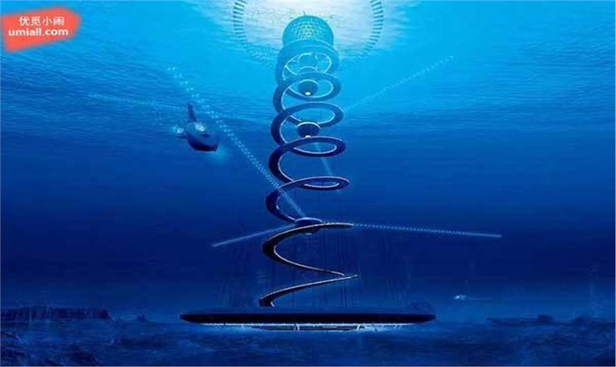 水下都市的下方有螺旋狀的支架一直延伸到海底。