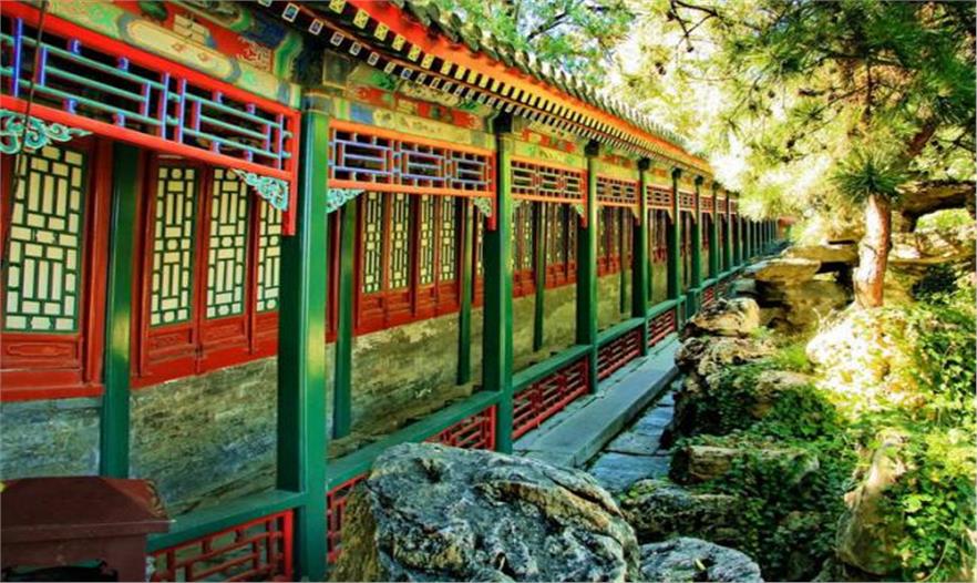 一般抄手游廊是進門后先向兩側(cè),再向前延伸,到下一個門之前又從兩側(cè)回到中間。在院落中,抄手游廊都是沿著院落的外緣而布置的,形似一個人抄手(將兩手交叉握在一起)時,胳膊和手形成環(huán)狀,所以叫 “抄手游廊”。