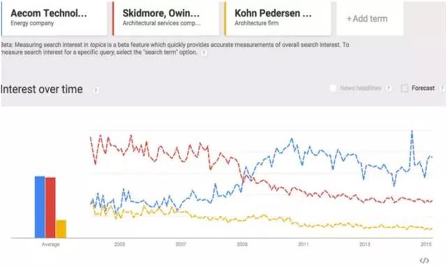 1.SOM和KPF這種傳統(tǒng)國際化大型建筑設(shè)計企業(yè)流行度下降。AECOM這種提供一站式服務(wù)的巨無霸流行度上升。谷歌沒說未來能存活的建筑公司只有三種。One stop shop,提供一站式服務(wù),服務(wù)懶惰的甲方。Architecture Thinker,服務(wù)有思想的甲方。Architectural Specialist,服務(wù)有特殊需求的甲方。