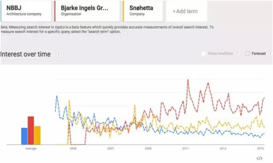 9.NBBJ流行度下降。比亞克英格斯初期上升但是近年流行度下降。斯諾海獺平穩(wěn)。斯諾海獺的標(biāo)簽是把北歐美麗的景觀融入建筑設(shè)計理念中,人們真的對景觀興趣那么大?