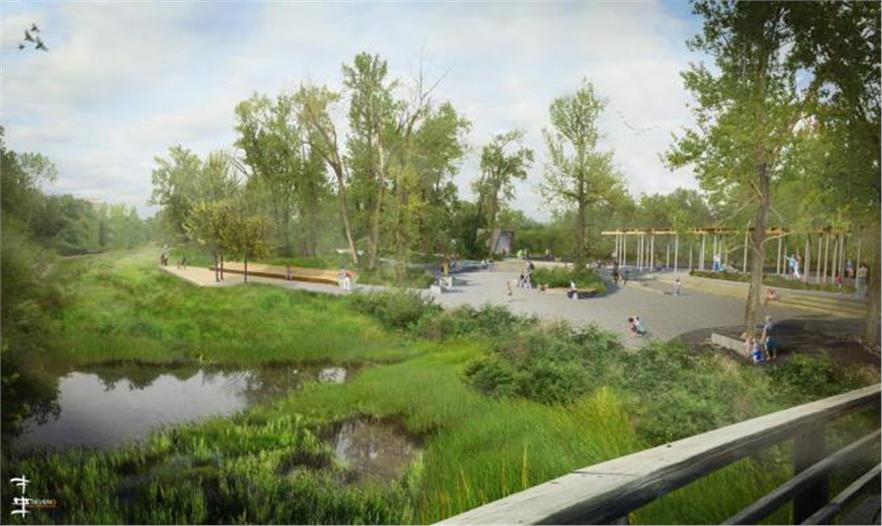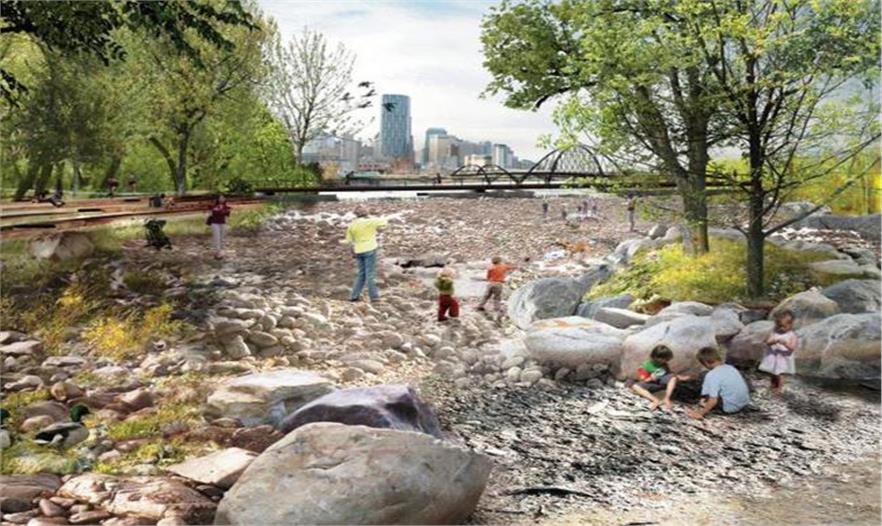這個新圣帕特里克島位于泄洪道上,是彈性設(shè)計(jì)的典范。這個設(shè)計(jì)方案將修復(fù)歷史河道,提供人們接觸水的安全通道。被移除去重建河道的土壤將被利用去建造一個能欣賞卡爾加里天際線景觀的“抬升區(qū)”、舉辦音樂會和活動的場所以及冬季滑雪橇的完美坡道。人行步道和特定的通道會保護(hù)新濕地和重要的生態(tài)區(qū)。這樣就建立了自然和城市的新關(guān)系。