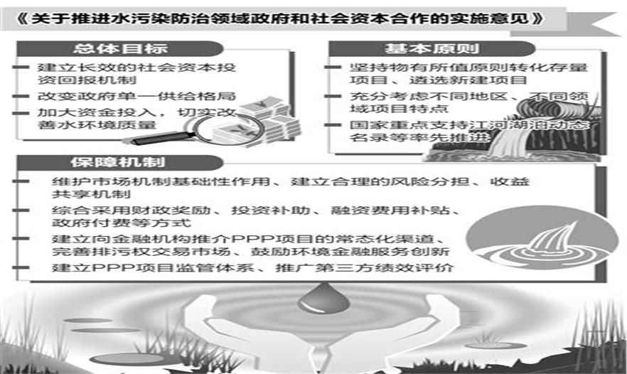 在環(huán)境保護(hù)中,政府和社會(huì)資本合作領(lǐng)域主要是以城市污水處理、垃圾處理處置為主,一般采用BOT、TOT等模式。記者注意到,兩部委印發(fā)的《意見》將政府和社會(huì)資本合作領(lǐng)域拓展到飲用水水源地環(huán)境綜合整治、湖泊水體保育、河流環(huán)境生態(tài)修復(fù)與綜合整治等城市污水、垃圾處置外的項(xiàng)目。該《意見》同時(shí)提出,將逐步實(shí)現(xiàn)水污染防治領(lǐng)域全面向社會(huì)資本開放,推廣運(yùn)用PPP模式。