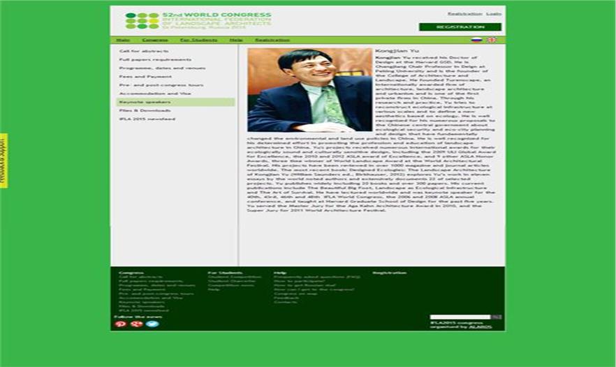 本次大會重磅出擊,邀請了眾多國際景觀設(shè)計大師,包括北京大學(xué)建筑與景觀設(shè)計學(xué)院院長俞孔堅(Kongian Yu)、圣彼得堡大學(xué)教授拉里薩•卡努尼科娃(Larisa Kanunnikova)、哈佛大學(xué)設(shè)計學(xué)院教授尼爾•柯克伍德(Niall G. Kirkwood)、瑞典農(nóng)業(yè)大學(xué)教授瑪利亞•伊格納娃(Maria Ignatieva)等等。其中俞孔堅他創(chuàng)立的土人設(shè)計,已成為國際景觀設(shè)計師聯(lián)盟會員。詳情請參考http://iflaonline.org/about/membership/join/。