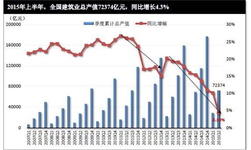 2015年上半年全國建筑業(yè)增加值18796億元,同比增長7.0%,同GDP增速持平。上半年,全國建筑業(yè)總產(chǎn)值72374億元,同比增長4.3%,增速自2013年以來持續(xù)下 滑,為國家公布建筑業(yè)總產(chǎn)值數(shù)據(jù)24年來最低增幅。按季度增幅對比,2015年第一季度增幅10.1%,第二季度增幅為0。全國建筑業(yè)房屋建筑施工面積91.91億平方米,同比增長3.1%,比一季度下滑4.4個百分點。