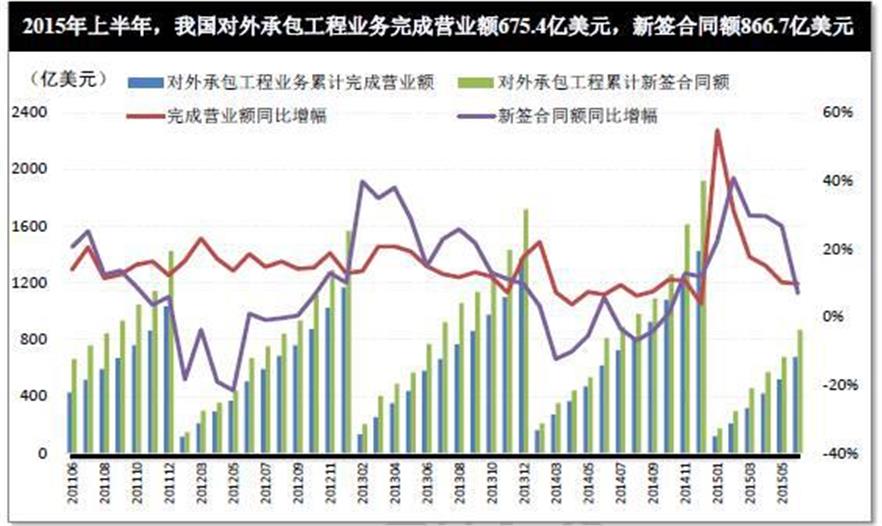 商務部公布,2015年上半年,中國對外承包工程業(yè)務完成營業(yè)額675.4億美元;同比增長9.7%,新簽合同額866.7億美元,同比增長6.9%。1~6月,新簽合同額在5000萬美元以上的項目313個,比上年同期增加11個,合計696.6億美元,占新簽合同總額的80.4%。其中上億美元的項目187個,同比增加19個。與2014年同期相比較,我國對外工程承包營業(yè)額增長2.8個百分點,新簽合同額同比增長32.2個百分點。