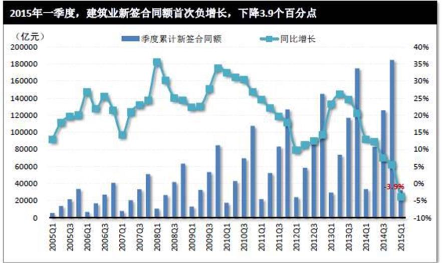 建筑業(yè)新簽合同額是企業(yè)未來一年建筑業(yè)產(chǎn)值規(guī)模的關鍵決定因素。2015年一季度,建筑業(yè)新簽合同額32256.91億元,同比下降3.9%,近10年首次出現(xiàn)新簽合同額同比負增長。至一季度,全國施工企業(yè)的累計合同額達到172031.45億元,同比增長9.3%,較同期增幅下降6.7個百分點,累計合同額的仍保持增長,主要源于企業(yè)上年結轉合同額的增長。