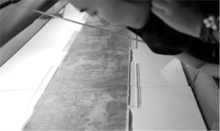 《五牛圖》剛收回時(shí)傷痕累累,1977年經(jīng)故宮專家重新揭裱、補(bǔ)筆、全色,這幅珍貴畫作才重新煥發(fā)生機(jī)。故宮武英殿西配殿里展出了一張1977年故宮博物院文物修復(fù)工廠的修復(fù)記錄,通過(guò)展出的照片,觀眾可以看到《五牛圖》從殘破不堪到完好如初的復(fù)原過(guò)程。
