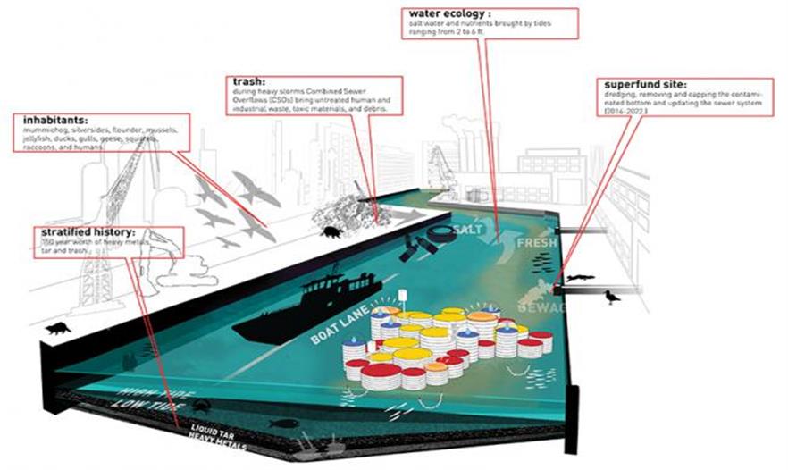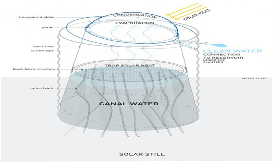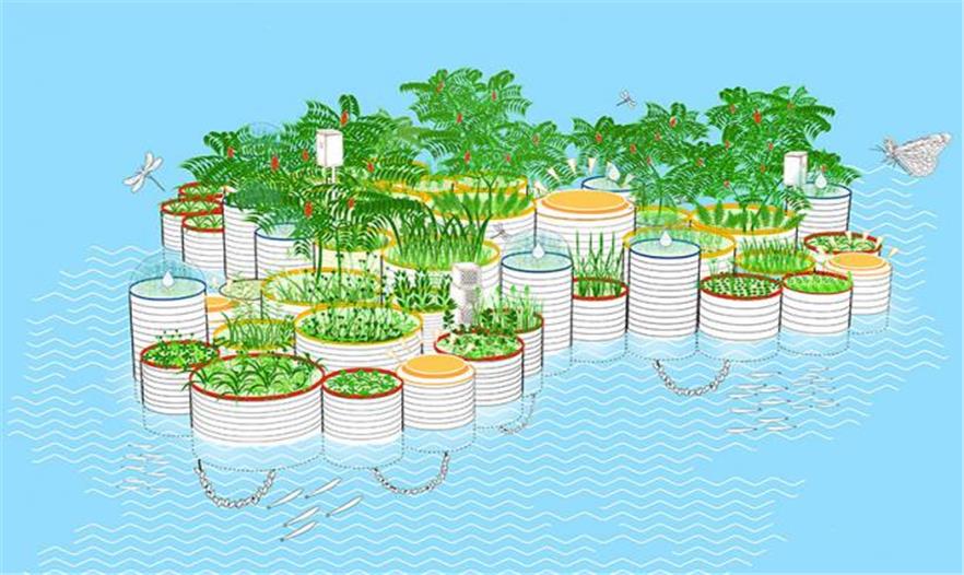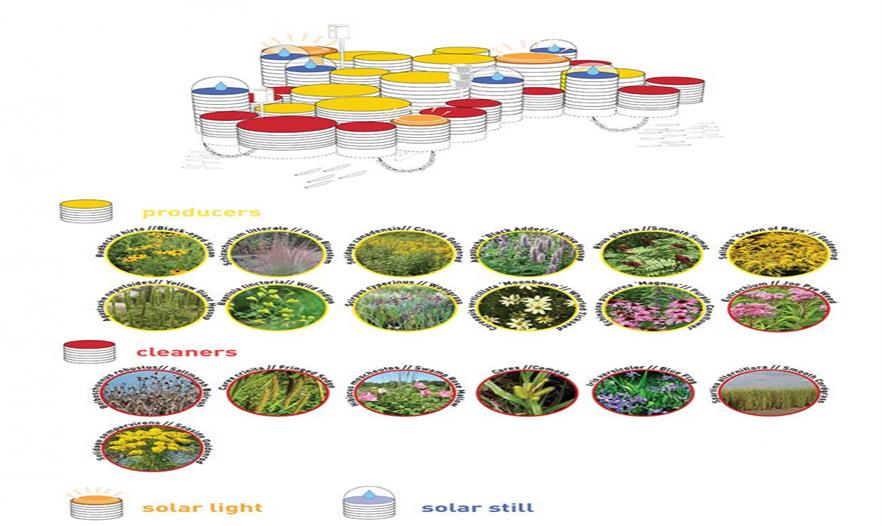 “依我成長”是正在進行項目中的一部分,balmori的設(shè)計像是海綿一樣逐漸過濾并清洗這段受污染的水域,并在NYC水域里提供野生植物棲息地。漂浮景觀由變形金屬排水管組成,54根試管都裝有不同的植物(其中30種都是通過精心挑選),有著不同的水域條件(通過植被恢復(fù)清潔水資源,以及通過蒸發(fā)凝聚收集水資源來淡化運河咸水),有著不同的漂浮結(jié)構(gòu)材料(椰子纖維、竹子、菌體和可再生性塑料)。