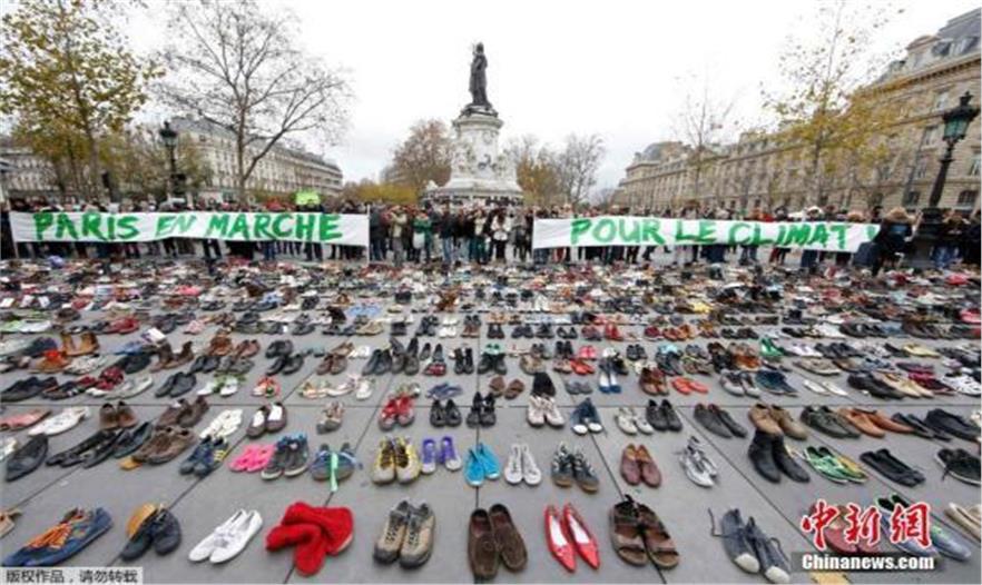 當?shù)貢r間11月29日,法國巴黎氣候大會前,民眾在巴黎共和國廣場擺滿了鞋子,呼吁關(guān)注氣候變化。