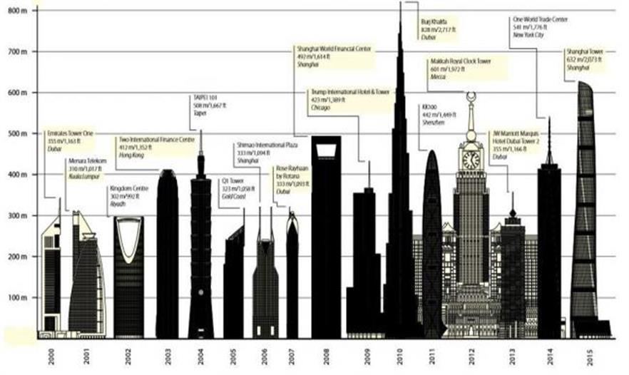 不僅摩天大樓數(shù)量增加,這些建筑的高度也在飆升。目前,世界上已經(jīng)有 100 座超過 300 米的“超高樓”,其中 13 座落成于 2015 年。超高樓拔地而起的速度也前所未有地快,2010-2015 年短短五年間就建成 50 座超高樓,而前 50 座則花了八十年的時間。