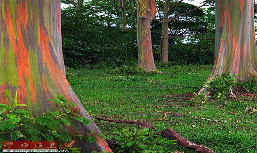 在夏威夷,剝桉色彩斑斕的樹皮看起來非常像人故意在上面潑了彩色的漆,事實上,它們的這身“外套”絕對是純天然的。走進剝桉樹林,會讓產(chǎn)生進入童話世界的幻覺。“剝桉”(Eucalyptus deglupta),又名彩虹桉,北半球發(fā)現(xiàn)的唯一一種桉樹,同一棵樹的樹皮有黃色、綠色、橙色甚至于紫色等多種顏色,因此得名。剝桉樹高可達到70米。