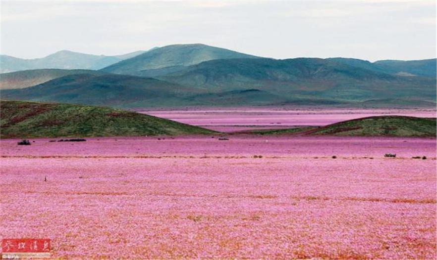 雨季時,在世界上最干燥的沙漠,智利阿塔卡馬沙漠會開出一片花海,仿佛粉色的地毯一般。
