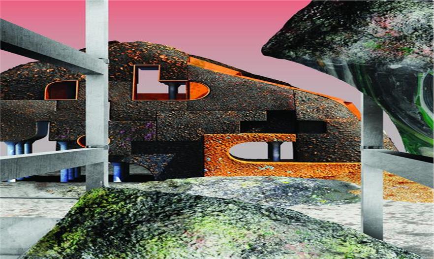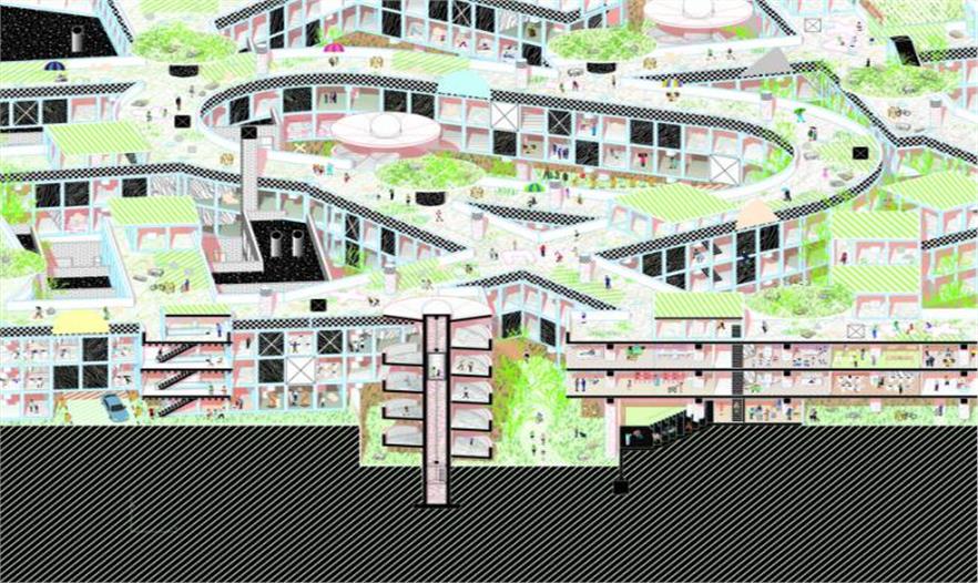 透視渲染圖展示出 megamasonry 山,由回收的建筑材料重新組合而成,并采用了Packard廠(chǎng)現(xiàn)存的柱網(wǎng)作為支撐結(jié)構(gòu)。該項(xiàng)目場(chǎng)地位于底特律Packard廠(chǎng)址。
