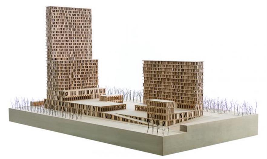 模型展示出巨型住區(qū)空間,采用交叉層壓木板制成。該項(xiàng)目場(chǎng)地位于底特律水岸的美國(guó)郵政管理局。