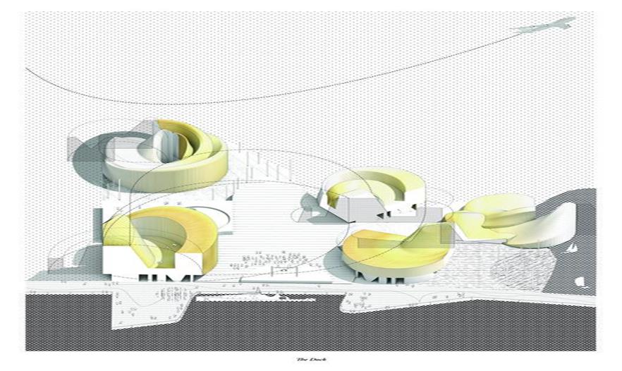 斜投影立體圖展示出碼頭、入境口岸、海關(guān)檢查站,和濱水娛樂(lè)設(shè)施。該項(xiàng)目針場(chǎng)地位于底特律水岸的美國(guó)郵政管理局。