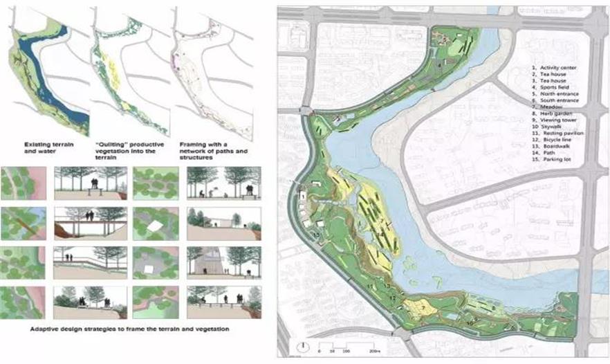 衢州鹿鳴公園位于衢州市西區(qū)石梁溪西岸,處于擁有250萬人口的衢州市的新城中心(商業(yè)、行政中心)之核心地段,是高密度城市建筑之中的一片“綠洲”。設(shè)計(jì)師將具有生產(chǎn)性的農(nóng)業(yè)景觀與低維護(hù)的鄉(xiāng)土植物融于景觀設(shè)計(jì)之中,創(chuàng)造出一個(gè)豐產(chǎn)而美麗的城市公園。一系列漂浮于植被和溪水之上的步行道、棧橋和亭臺(tái)等構(gòu)成一個(gè)游憩網(wǎng)絡(luò),讓人悠游于山水自然之中,而又不給自然過程造成過度的干擾。城市遺棄地由此轉(zhuǎn)變成豐產(chǎn)而美麗的景觀,同時(shí)保留了場(chǎng)地的生態(tài)特色與文化遺產(chǎn)。通過探索人工建設(shè)與自然元素的平衡,實(shí)現(xiàn)人與自然的和諧共生。