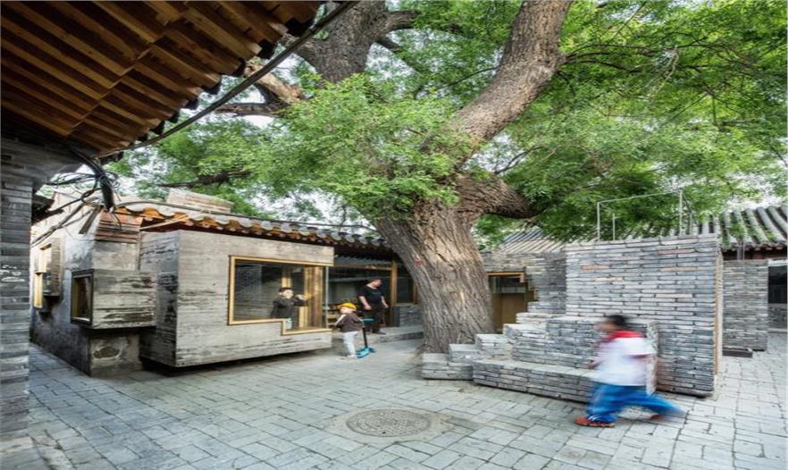 北京胡同在快速消失。帶有多個空間層次的居住院落集合通常是雜亂無章的,甚至是用戶體驗差的,有些像某些國家的貧民區(qū)。如果說到現(xiàn)代城市里的場所,往往是那種干凈整潔,精品店林立,游人為之吸引的地方。設(shè)計力圖尋找一種方式,能夠為胡同這種傳統(tǒng)建筑形式帶來新的使用方式——讓當(dāng)?shù)赜脩裟軌蚴芑萦诖?mdash;—希望該方案能夠讓周邊的小學(xué)生和以老年群體為主的“老北京”受益。除了兒童圖書館與展覽空間,院子中央容納了一處手工藝工坊和繪畫與舞蹈的教學(xué)場地。