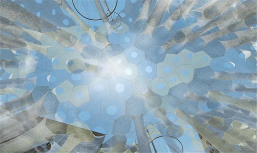 Lumen裝置在白天一直在變化,遮擋陽光,提供陰涼,日落后提供人工照明。這是經(jīng)由一個管狀的格子蓬蓋達成的,因為這個蓬蓋包括回收的、發(fā)光和隨太陽活動的紡織布,吸收、收集以及放射光。這個蓬蓋隨著日光發(fā)生變化,必要時吸收和產(chǎn)生光。與此同時,紡織制成的鐘乳石會對游客的親近做出反應(yīng),釋放迷霧,讓這個適應(yīng)性結(jié)構(gòu)對應(yīng)溫度以及人群的密度進行變化。