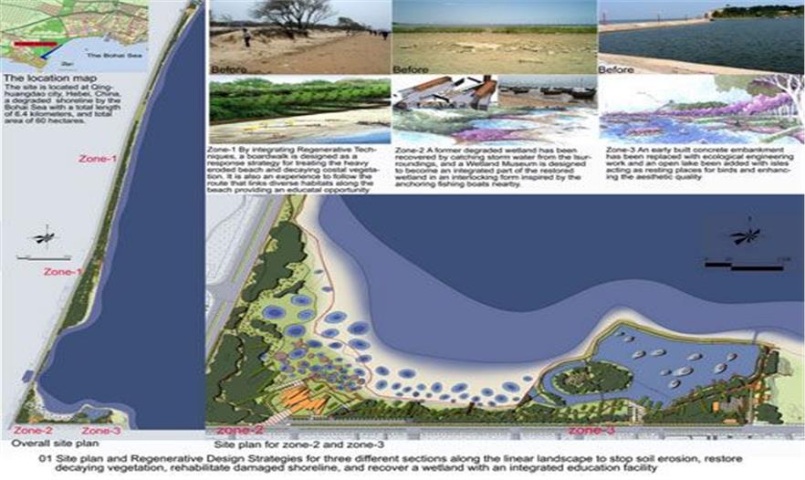 該項(xiàng)目位于中國(guó)北部河北省的沿海旅游城市秦皇島市的渤海海岸線上,長(zhǎng)6.4公里,面積為60公頃。整個(gè)項(xiàng)目在環(huán)境和生態(tài)上呈現(xiàn)受損的狀態(tài)。沿海的沙丘受到嚴(yán)重侵蝕,海岸植被退化,海灘荒廢布滿垃圾;之前的欠考慮的開(kāi)發(fā)破壞了沿岸濕地,使其沙礫遍地。