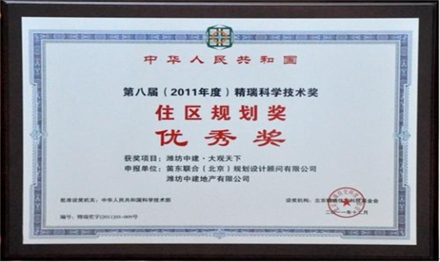 12月8日,2011第8屆中國人居精瑞獎(jiǎng)?lì)C獎(jiǎng)典禮在深圳瑞吉酒店舉行,笛東聯(lián)合濰坊中建·大觀天下項(xiàng)目榮獲中國人居精瑞獎(jiǎng)·住區(qū)規(guī)劃優(yōu)秀獎(jiǎng)。