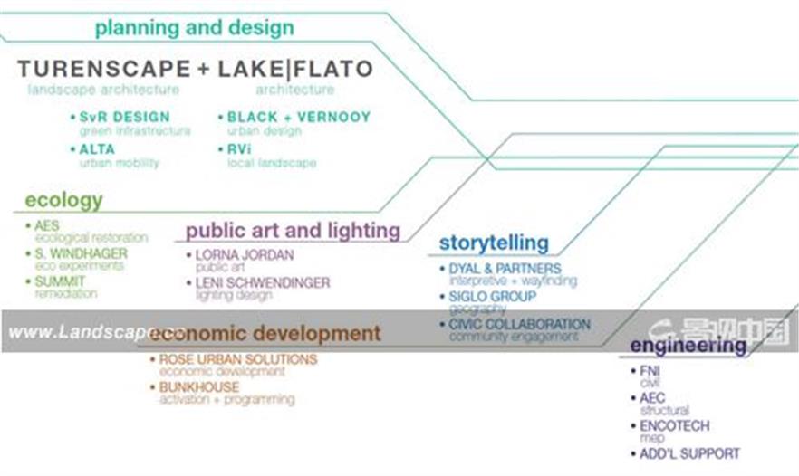 該團(tuán)隊(duì)的項(xiàng)目設(shè)計(jì)與規(guī)劃的核心成員包括景觀界的領(lǐng)軍人俞孔堅(jiān)和土人景觀的合伙人凌世紅。俞孔堅(jiān)和凌世紅合作的2010年上海世博會(huì)后灘公園,曾獲得2010年的美國(guó)景觀設(shè)計(jì)師協(xié)會(huì)優(yōu)秀獎(jiǎng)的最高榮譽(yù)。核心成員還包括建筑界領(lǐng)袖David Lake和Lake|Flato建筑事務(wù)所的合伙人Bob Harris。在現(xiàn)代綠色項(xiàng)目的設(shè)計(jì)中David Lake和Bob Harri聯(lián)手為L(zhǎng)ake|Flato建筑事務(wù)所屢獲殊榮,目前正著手于奧斯汀的中央公共圖書(shū)館項(xiàng)目。團(tuán)隊(duì)的項(xiàng)目經(jīng)理Nate Cormier與合伙人密切合作,通過(guò)對(duì)事務(wù)所團(tuán)隊(duì)與項(xiàng)目及利益相關(guān)者的溝通,協(xié)調(diào)好公司之間的運(yùn)作。該核心團(tuán)隊(duì)專(zhuān)屬于地方和國(guó)家領(lǐng)導(dǎo),將為城市設(shè)計(jì)提供專(zhuān)業(yè)的支持。