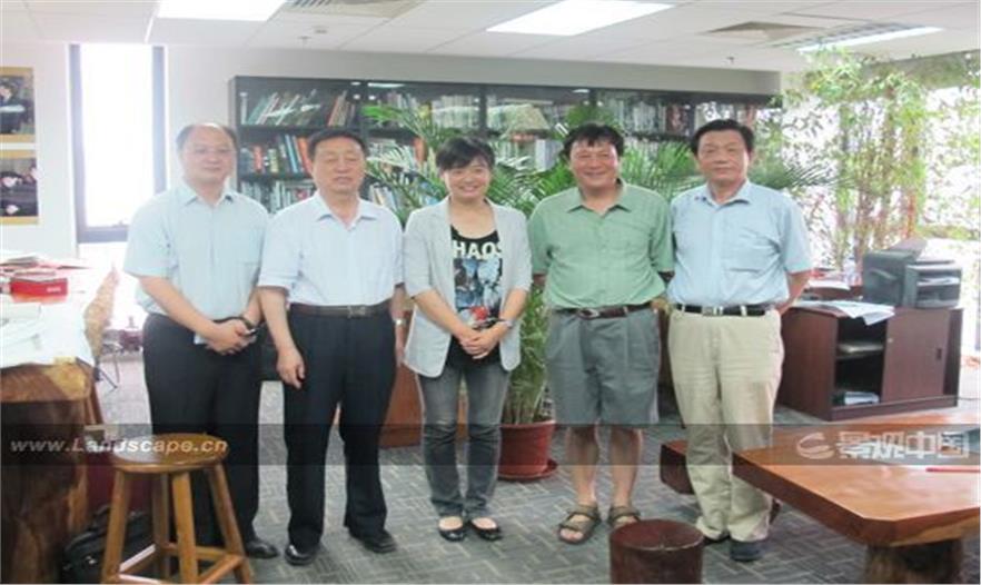 北京海外學(xué)人中心主任袁方(左一)、北京海外學(xué)人中心首席顧問(wèn)夏穎奇(左二)、都市意匠城鎮(zhèn)規(guī)劃設(shè)計(jì)(北京)中心總裁朱冰博士(中)、北京土人城市景觀規(guī)劃設(shè)計(jì)公司總裁俞孔堅(jiān)博士(右二)、海淀創(chuàng)業(yè)園副主任王士琦(右一)在俞孔堅(jiān)辦公室合影