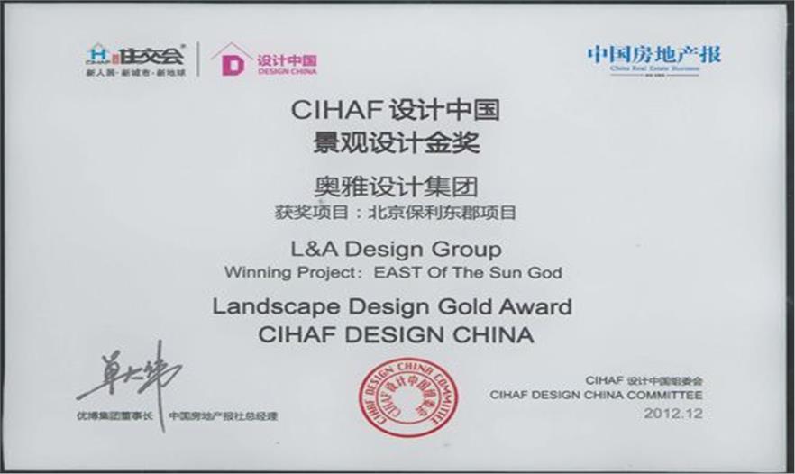 當天下午論壇結束后,CIHAF設計中國大獎的頒獎典禮在住交會現(xiàn)場隆重舉行。奧雅設計集團榮獲三個獎項,其中“北京保利東郡項目”獲得“CIHAF設計中國—景觀設計”金獎,“蕪湖中央文化公園項目”獲得“CIHAF設計中國—景觀設計”優(yōu)勝獎,董事及設計總監(jiān)李寶章獲“CIHAF設計中國—2012中國景觀設計師年度貢獻獎”。
