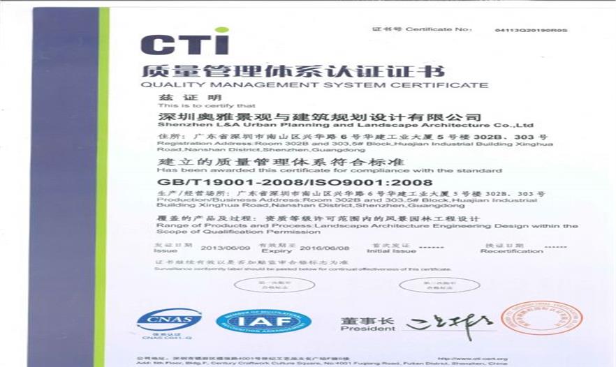 6月13日,奧雅設計集團深圳總部正式獲得CTI頒發(fā)的GB/T19001-2008/ISO9001:2008質量管理體系認證證書。這不僅表明奧雅的質量管理體系符合GB/T19001-2008/ISO9001:2008標準,也標志著奧雅的產(chǎn)品和服務踏上了具備國際信譽的新臺階。