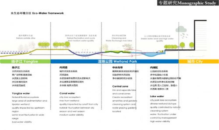 作為沿長江動(dòng)態(tài)蜿蜒的公園結(jié)構(gòu),設(shè)計(jì)理念的靈感一方面來自長江的流動(dòng);而另一方面則來自獨(dú)具南京城市特色的雨花石。“交流與環(huán)抱”的概念意在重新思考城市與自然的關(guān)系。為了使流域及周邊地區(qū)散發(fā)活力,組織和建設(shè)一個(gè)自然系統(tǒng),使之能夠承載真實(shí)而豐富的生態(tài)系統(tǒng),與此同時(shí)在周邊區(qū)域搭建獨(dú)特的發(fā)展框架。“交流”指的是整合完善連貫體系的機(jī)制,這些體系包括工程水文系統(tǒng)、人行步道、戶外休閑體系和交通體系。“環(huán)抱”指的是以自然景觀為基礎(chǔ)創(chuàng)造出新型生態(tài)景觀,以使南京現(xiàn)有的自然系統(tǒng)諸如河流、湖泊、山丘、森林、陡坎等重?zé)ㄉ鷻C(jī)。