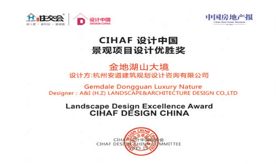 2013年12月,CIHAF設(shè)計(jì)中國(guó)大獎(jiǎng)?lì)C獎(jiǎng)儀式在CIHAF2013中國(guó)住交會(huì)上舉行,安道國(guó)際湖山大境項(xiàng)目獲得景觀設(shè)計(jì)項(xiàng)目?jī)?yōu)勝獎(jiǎng)。CIHAF 設(shè)計(jì)中國(guó)大獎(jiǎng)是中國(guó)地產(chǎn)行業(yè)的建筑景觀設(shè)計(jì)類的最高榮譽(yù),由《中國(guó)房地產(chǎn)報(bào)》、優(yōu)博集團(tuán)、CIHAF 中國(guó)住交會(huì)主辦,致力于為開發(fā)商尋找最值得合作的設(shè)計(jì)方,為設(shè)計(jì)方尋找最值得信賴的開發(fā)商,共同促進(jìn)房地產(chǎn)行業(yè)良性發(fā)展。