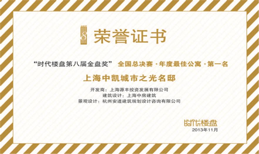 2013年12月,《時(shí)代樓盤》第八屆金盤獎(jiǎng)全國(guó)總決選也落下帷幕,安道國(guó)際景觀設(shè)計(jì)項(xiàng)目上海中凱城市之光名邸項(xiàng)目獲得全國(guó)年度最佳公寓第一名。 “金盤獎(jiǎng)”是著名地產(chǎn)專業(yè)雜志《時(shí)代樓盤》舉辦的房地產(chǎn)設(shè)計(jì)類的綜合性大獎(jiǎng),是房地產(chǎn)界、地產(chǎn)設(shè)計(jì)行業(yè)內(nèi)最權(quán)威的專業(yè)獎(jiǎng)項(xiàng)之一。