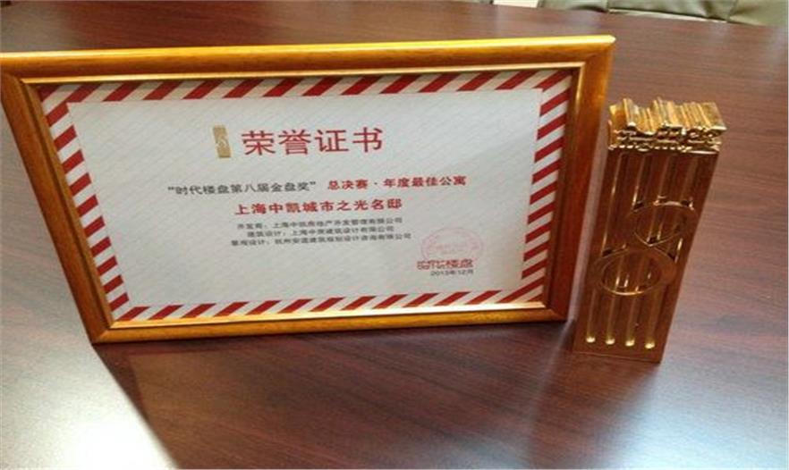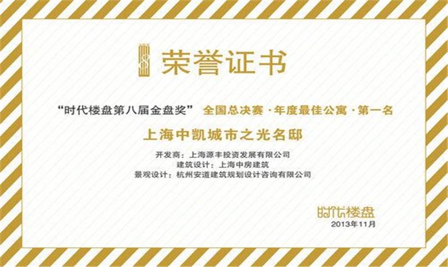 2013年12月12日,第八屆金盤獎頒獎盛典在廣州保利世貿(mào)展覽館舉行,我司景觀設(shè)計項目上海中凱城市之光名邸項目獲得年度最佳公寓第一名。