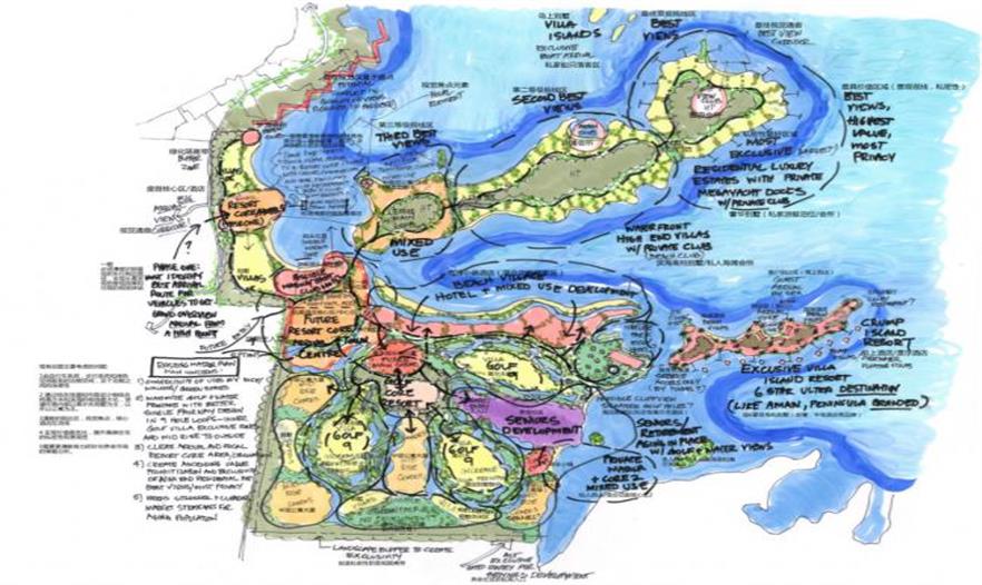 安提瓜島度假天堂項(xiàng)目總占地約650公頃,由一眾大小、 特征不同的地塊區(qū)域組成,包括一個(gè)位于藤壺角的奢華迎賓區(qū)、三個(gè)小島(美人島、兔子島和科隆博島)、一個(gè)大島(圭亞那島),以及內(nèi)陸上大片區(qū)域(科隆博半島)。在奧雅團(tuán)隊(duì)的設(shè)計(jì)方案中,項(xiàng)目的每個(gè)部分都被賦予了獨(dú)立品牌身份,總體規(guī)劃方案也因此更加豐富多彩、充滿活力。整個(gè)設(shè)計(jì)概念細(xì)致入微地將全新方案融入到原始場(chǎng)地環(huán)境中,并且和島上的熱帶景觀緊密結(jié)合。設(shè)計(jì)愿景具體展現(xiàn)在對(duì)安提瓜的色彩、景觀和整體氛圍的詮釋上,力求打造一個(gè)完全與環(huán)境相融合的特許之地。