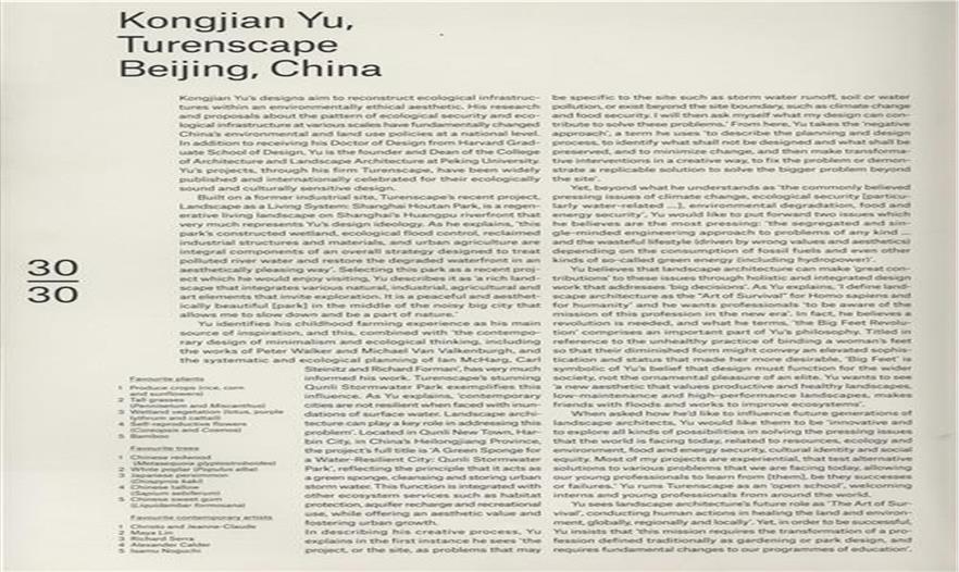 “[俞孔堅(jiān)]期待未來的景觀設(shè)計(jì)師‘能更具創(chuàng)新精神,并努力探求一切可能性來解決當(dāng)今世界所面臨的各種緊要問題,比如資源短缺、生態(tài)和環(huán)境惡化、食物和能源安全問題、文化認(rèn)同和社會公正問題。我(俞孔堅(jiān))的大多數(shù)項(xiàng)目都屬探索性的,我們對各種問題都嘗試采用不同的解決方案,使年輕一代的設(shè)計(jì)師能從中獲益,無論是成功還是失敗。’俞孔堅(jiān)將土人設(shè)計(jì)公司比作‘開放式學(xué)校’,歡迎來自世界各地的年輕設(shè)計(jì)師前去實(shí)習(xí)和工作。”
