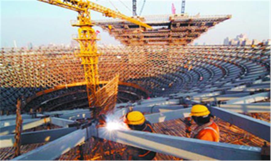 施工人員對4號“陽光谷”鋼結構桿件進行最后焊接。