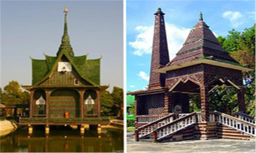 泰國(guó)西薩菊省Wat Pa Maha Chedi Kaew寺廟是由超過100萬個(gè)回收的綠色和棕色啤酒瓶建造的,聰明的僧侶這樣做是一舉兩得,他們回收利用這些丟棄的啤酒瓶,治理了當(dāng)?shù)氐沫h(huán)境污染;此外,他們還利用啤酒瓶廉價(jià)地建造了自己的寺廟。從寺廟的水塔至游客的洗手間,都是用喜力牌和象牌啤酒瓶建造。