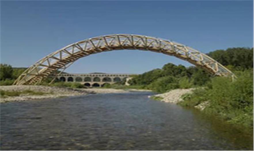 日本建筑師阪茂(Shigeru Ban)在法國(guó)南部加登河上使用普通的硬紙筒建造起一座橋梁,阪茂以合理使用環(huán)保輕型材料而聞名,他稱自己希望通過建造這座硬紙筒大橋告訴人們紙可以更結(jié)實(shí)和耐用。雖然這座硬紙筒大橋看上去很脆弱,但它曾經(jīng)可以承受20人的重量。2007年,這座大橋?qū)ν忾_放使用了6個(gè)月,之后由于雨季的到來不得不拆去。