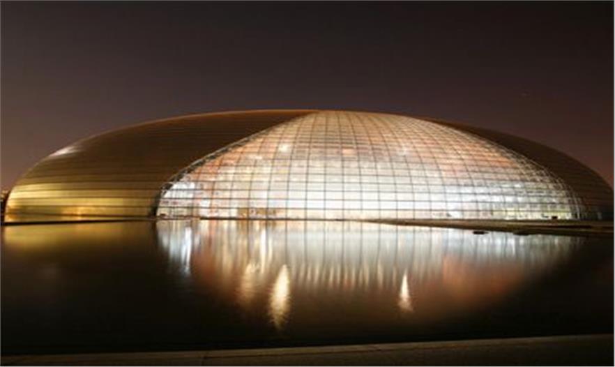 國家大劇院中心建筑為獨(dú)特的殼體造型,高46.68米,地下最深32.50米,周長達(dá)600余米。殼體表面由18398塊鈦金屬板和1226多塊超白玻璃巧妙拼接,營造出舞臺(tái)帷幕徐徐拉開的視覺效果。殼體周圍是面積達(dá)3.55萬平方米的人工湖及由大片綠植組成的文化休閑廣場,不僅美化了大劇院外部景觀,也體現(xiàn)了人與自然和諧共融的理念。