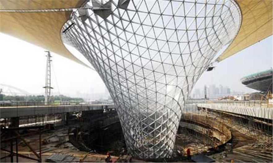近日,6個(gè)巨型圓錐狀世博軸“陽(yáng)光谷”全部亮相上海世博園區(qū)。提到地下空間,大多給人的印象是昏暗與沉悶,然而世博軸的“陽(yáng)光谷”使這一問(wèn)題迎刃而解。“陽(yáng)光谷”每個(gè)高40米,上口最大直徑為90米,分布在世博軸的入口及中部,它們的獨(dú)特形態(tài)能夠幫助陽(yáng)光自然傾斜到地下,既利于提高空氣質(zhì)量,又能節(jié)省人工照明帶來(lái)的能源消耗?!瓣?yáng)光谷”就如同一個(gè)“漏斗”,通過(guò)表面巨膜的合理遮擋,可達(dá)到有效的遮光作用?!瓣?yáng)光谷”還具備雨水采集功能,經(jīng)循環(huán)處理的雨水可用于世博園區(qū)廁所、綠化灌溉等用水。